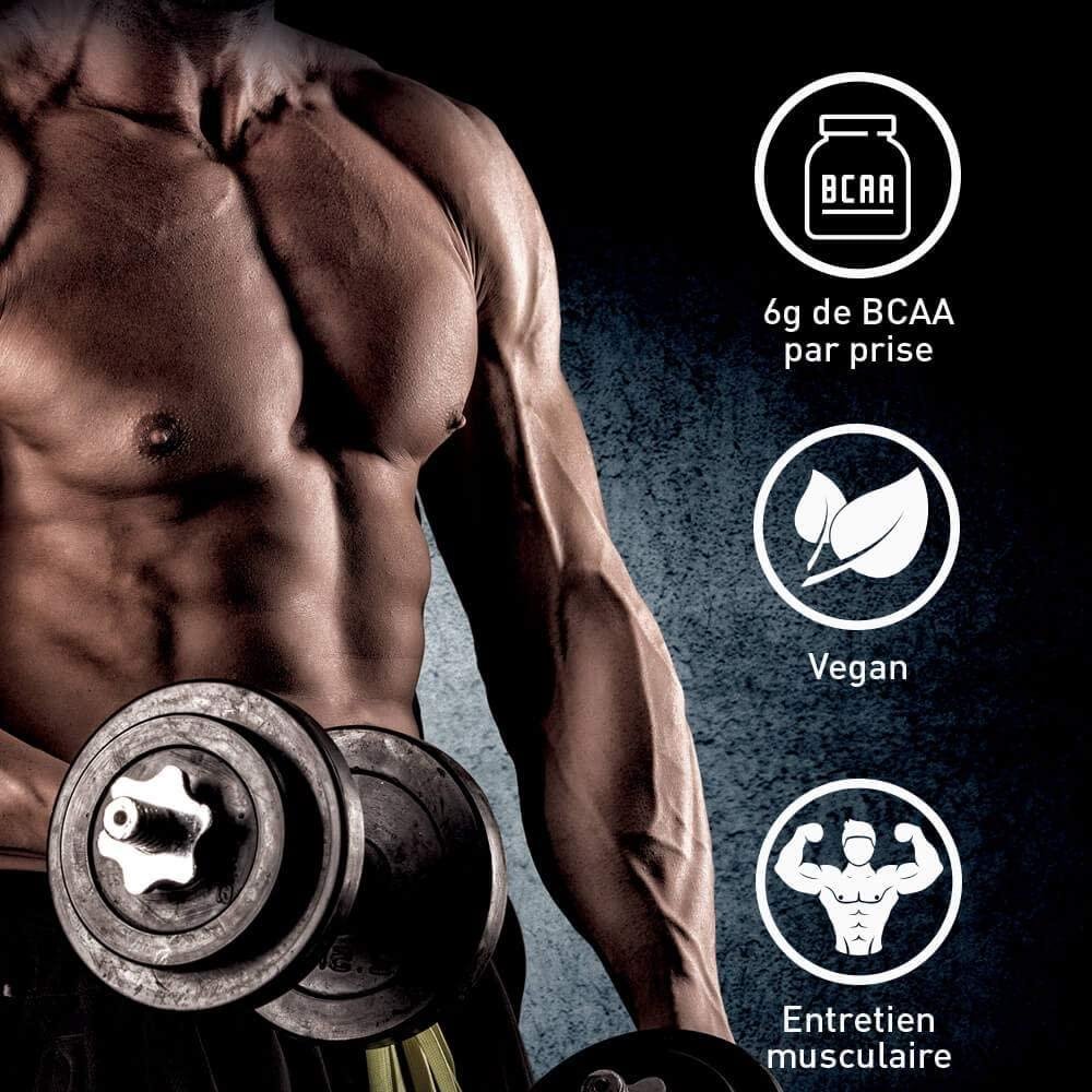 La B.C.A.A. (branched-chain amino acids) o aminoácidos ramificados agrupan 3 aminoácidos esenciales: leucina, isoleucina y valina. Están muy presentes en el tejido muscular y por lo tanto entran en la constitución del músculo. Una contribución en BCAA es por lo tanto esencial durante la práctica de un deporte y esto, sea cual sea (body fitness, deportes de resistencia, explosivos...). No son sintetizados por el cuerpo, sino que deben ser suministrados por los alimentos y/o suplementos.