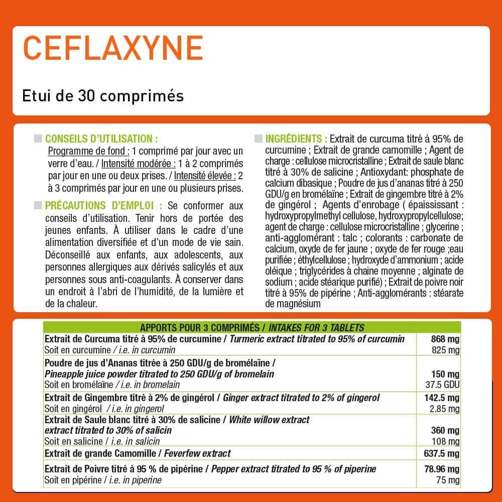 Apports pour 3 comprimés : Extrait de Curcuma titré a 95% de curcumine : 868 mg soit en Curcumine : 825 mg Extrait d'ananas titré à 250GDU/G : 150mg Soit en bromélaïne : 37.5 GDU Extrait de gingembre titré à 2% en gingérol : 142.5mg soit en gingérol : 2.85mg Extrait de saule blanc titré à 30% de salicine : 360mg Soit en salicine : 108mg Extrait de grande camomille : 637.5mg Extrait de poivre titré à 95% de pipérine : 78.96mg Soit en pipérine : 75mg
