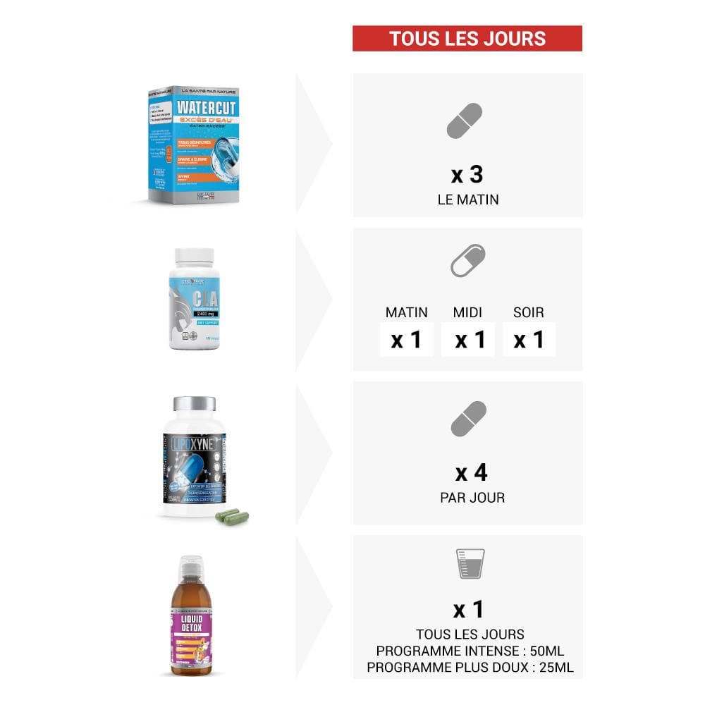 Programme intense : diluer 50ml dans un grand verre d’eau ou une bouteille d’eau de 50cl, pendant 10 jours.
