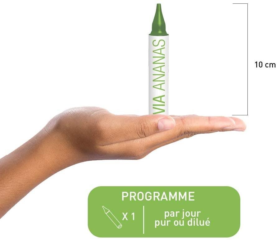 Pratique et simple d’utilisation, VIA ANANAS permet de brûler les graisses et de favoriser la perte de poids grâce au guarana1. Associé aux extraits de thé vert, d’ananas et de queues de cerises et grâce à sa saveur gourmande, ces shots deviendront rapidement votre geste minceur1.