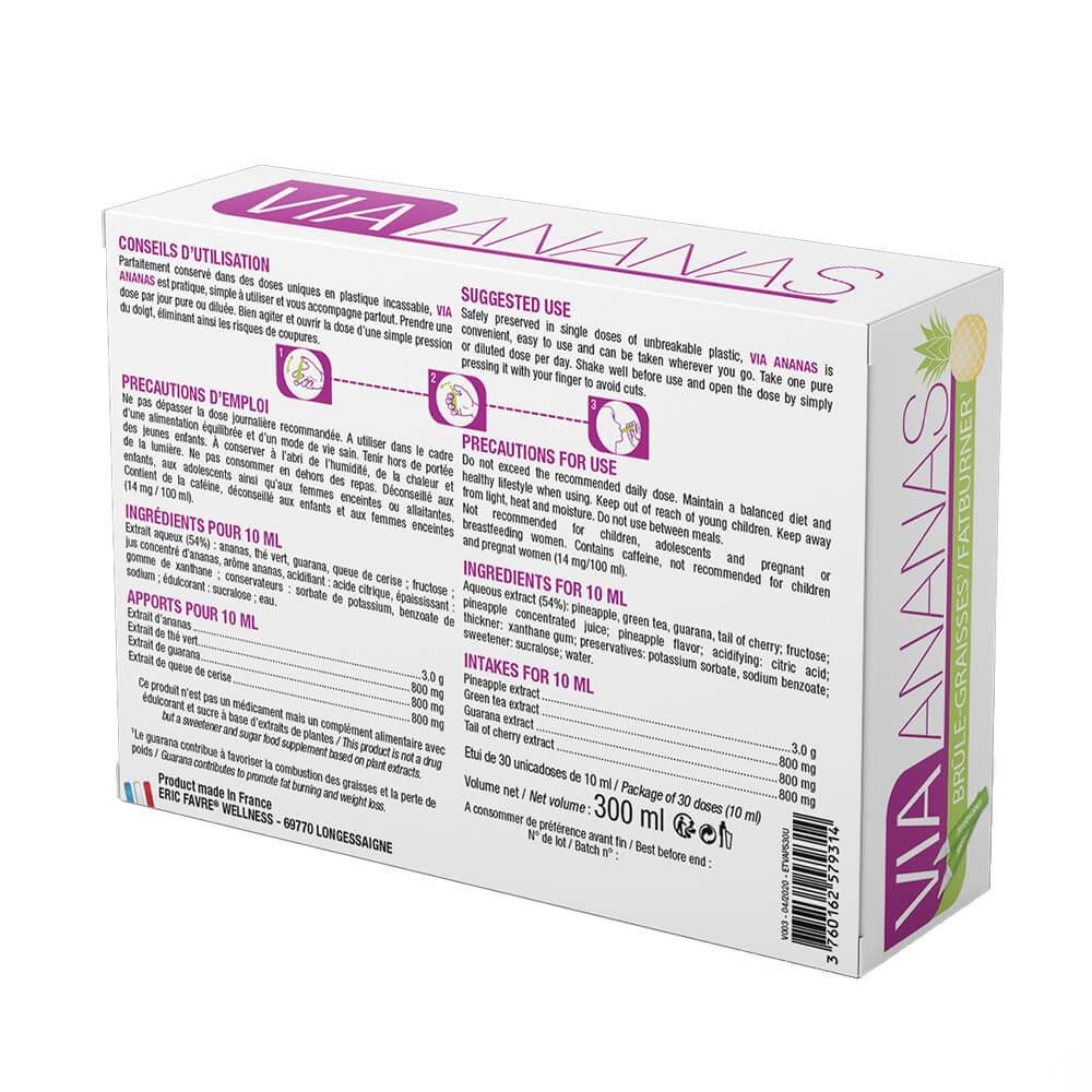 Grâce à la présence du Guarana, via Ananas va contribuer à la combustion des graisses.