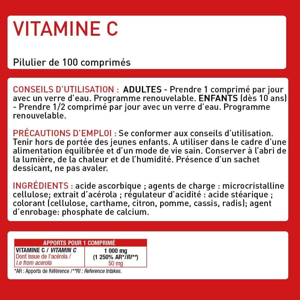 Vitamine C 1000mg ( 1 250% AR*) dont 50mg issu de l’acérola.