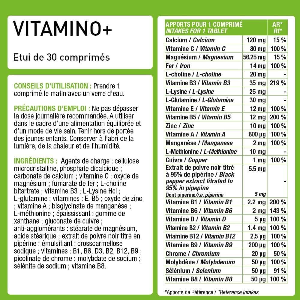 AGENTS DE CHARGE : CELLULOSE MICROCRISTALLINE, PHOSPHATE DICALCIQUE, CARBONATE DE CALCIUM, VITAMINE C, OXYDE DE MAGNESIUM, FUMARATE DE FER, L-CHOLINE BITARTRATE, VITAMINE B3, L-LYSINE, L-GLUTAMINE, VITAMINES : E, B5, OXYDE DE ZINC, VITAMINE A, BISGLYCINATE DE MANGANESE, L-METHIONINE, EPAISSISSANT : GOMME DE XANTHANE, GLUCONATE DE CUIVRE, ANTIAGGLOMERANTS : STEARATE DE MAGNESIUM, ACIDE STEARIQUE, EXTRAIT DE POIVRE NOIR TITRE EN PIPERINE, EMULSIFIANT : CROSCARMELLOSE SODIQUE, VITAMINES : B1, B6, D3, B2, B12, B9, PICOLINATE DE CHROME, MOLYBDATE DE SODIUM, SELENITE DE SODIUM, VITAMINE B8.
